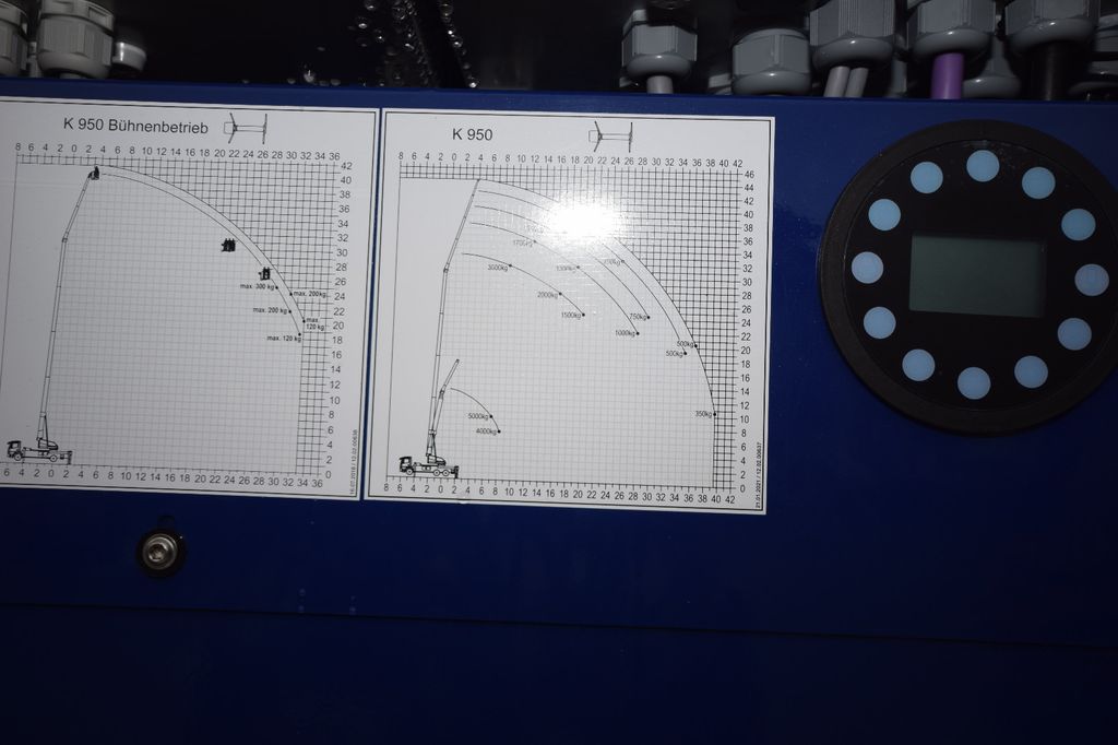 Der K950 mit einer Hakenhöhe von über 43 m ist ein wahres Kraftpaket: 5.000 kg können problemlos 9 m hoch und 7 m weit gehoben werden. Besonders auf engen Baustellen spielt der Alu-Kran seine Vorteile aus: Durch einen geringen Radstand behält der Zweiachser seine Wendigkeit, die hydraulisch teleskopierbare Klappspitze kann auch bei geringem Platzangebot per Funkfernsteuerung ausgefahren werden. Der K950 ist serienmäßig mit einem Hybridantrieb ausgestattet: So kann er je nach Baustellengegebenheiten über einen geräusch- und emissionsarmen Elektromotor oder einen sparsamen Dieselmotor betrieben werden.