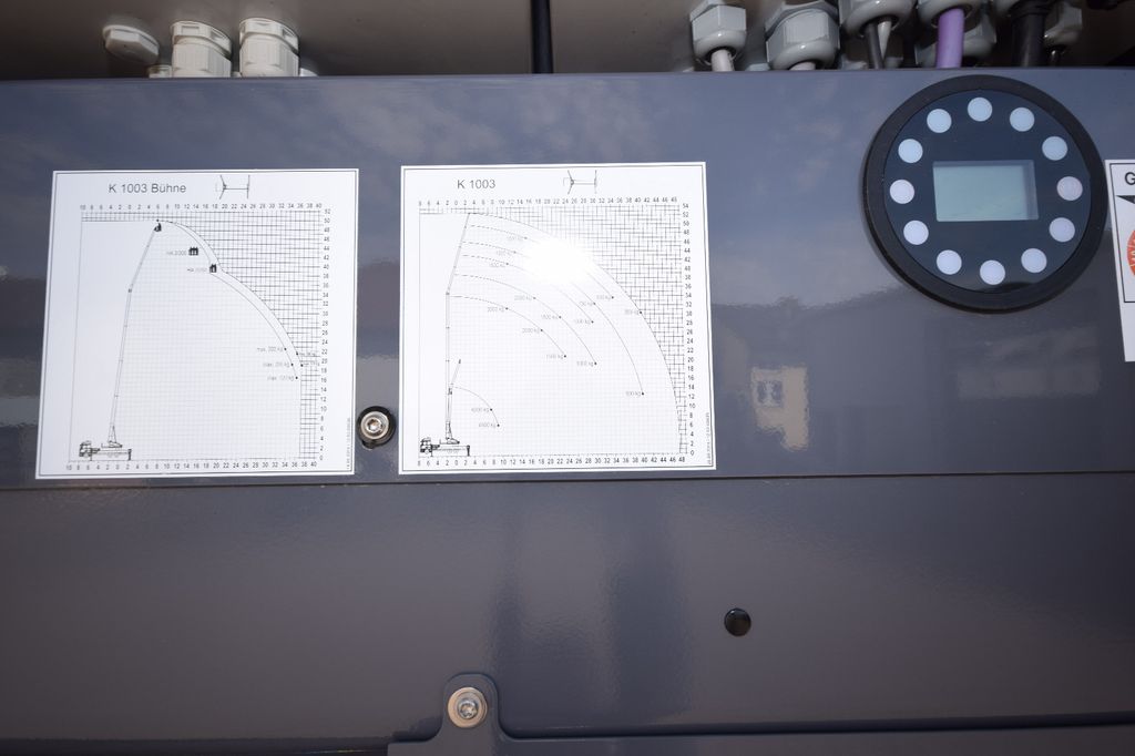 Der K1003 zählt mit seiner Hakenhöhe von fast 53 Metern und einer maximalen Traglast von 6 Tonnen zu den großen Klaas Autokranen. Aufgebaut wird er auf einen dreiachsigen LKW mit einer hinteren lenkbaren Achse. So werden Wendigkeit und komfortables Fahrverhalten mit den enormen Reichweiten des Aluminium-Auslegers ideal kombiniert. Der K1003 arbeitet mit einer zweifach teleskopierbaren Klappspitze, bei der beide Auszüge gleichmäßig und gleichzeitig ausgefahren werden. Dadurch wird das zu tragende Gewicht optimal verteilt und die Klappspitze kann auch in engen Aufbausituationen weitreichend genutzt werden.